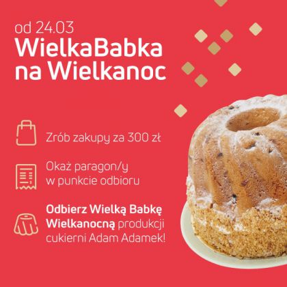 Już od 24 marca, za każde zakupy o wartości co najmniej 300 zł i udokumentowane maksymalnie dwoma paragonami, klienci Centrum Serenada otrzymają wielką babkę wielkanocną od Cukierni Adamek.