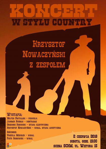 Zapraszamy wszystkich fanów muzyki country, rockabilly, a także klimatów western na występ Krzysztofa Nowaczyńskiego, który zaśpiewa i zagra dla Was covery znanych klasyków gatunku wraz z zespołem w składzie: Wojtek Światalski – perkusja, Jaromir Rusnak – kontrabas, Grzegorz Kosowski – gitara elektryczna, Krzysztof Nowaczyński – wokal, gitara akustyczna. Gościnnie wystąpią: Urszula Misiołek – wokal, Piotr Ogonowski – wokal.