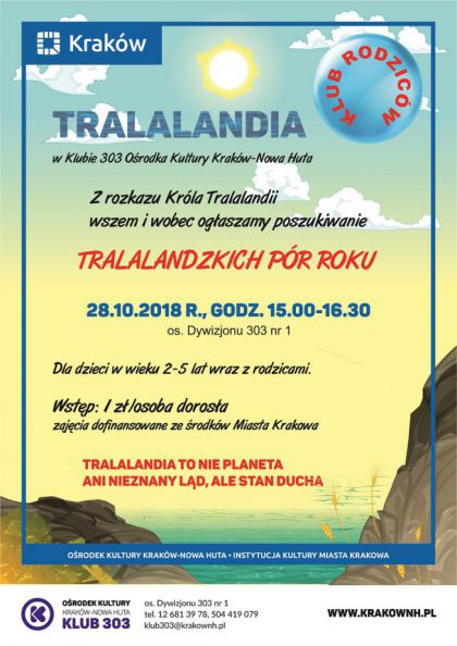 Klub 303 Ośrodka Kultury Kraków-Nowa Huta (os. Dywizjonu 303 nr 1) zaprasza 28 października w godz. 15.00-16.30 na kolejne spotkanie z Tralalandią. Czy w Tralalandii zmieniają się pory roku? Jaka teraz w tej tajemniczej krainie jest pora roku i jak się ona nazywa? Czy choć trochę jest podobna do naszej jesieni? Podczas kolejnego spotkania z Tralalandią będziemy poznawać tralalandzkie pory roku. Spróbujemy je narysować, namalować lub wykleić na wielkich planszach. Jeżeli chcecie dołączyć do grona badaczy tralalandzkiej przyrody przynieście ze sobą materiały i narzędzia, które uznacie za przydatne w tworzeniu plansz. Do zobaczenia w Tralalandii.