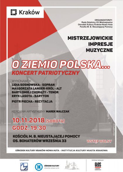 11 listopada 1918 roku, po stu dwudziestu trzech latach niewoli, Polska odzyskała niepodległość. W tym roku w całym kraju obchodzimy setną rocznicę tych wydarzeń. Również organizatorzy cyklu Mistrzejowickie Impresje Muzyczne, pragną podkreślić ten doniosły fakt koncertem zatytułowanym O ziemio polska...