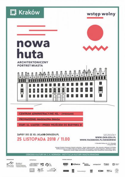 Zwiedzanie Budynku Z Centrum Administracyjnego Huty w ramach projektu Nowa Huta – architektoniczny portret miasta. Prowadzenie: Magdalena Smaga (MHK). Zapisy do 22 XI: j.klas@okn.edu.pl. Wstęp wolny.