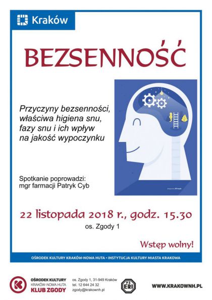 Klub Zgody Ośrodka Kultury Kraków-Nowa Huta (os. Zgody 1) zaprasza 22 listopada o godz. 15.30 na wykład, poświęcony bezsenności. O tym, jakie są przyczyny tej poważnej dolegliwości i jak jej zapobiegać oraz na czym polega właściwa higiena snu opowie mgr farmacji Patryk Cyb. Słuchacze wykładu dowiedzą się, jakie istnieją fazy snu i poznają ich wpływ na jakość nocnego wypoczynku.
