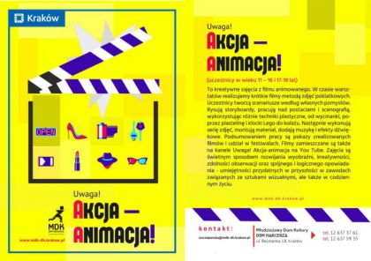 To kreatywne zajęcia z filmu animowanego tradycyjną metodą zdjęć poklatkowych. Uczestnicy tworzą własne scenariusze, rysują storyboardy, wykonują elementy scenografii, bohaterów. Wykorzystują różne techniki plastyczne, od wycinanki, poprzez plastelinę, kolaż, pikselację.