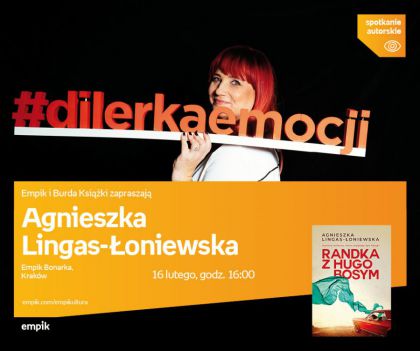 Agnieszka Lingas-Łoniewska to wrocławska pisarka zwana przez swoich czytelników Dilerką Emocji. Autorka ponad 30 bestsellerowych powieści stanowiących połączenie romansu, dramatu i sensacji. Kocha zwierzęta, ma cztery koty i psa. W wolnym czasie, kiedy nie pisze, kocha czytać i oglądać seriale kryminalne. Jej pasją są także nordic walking i robótki ręczne. Do Krakowa przyjedzie w związku z premierą swojej najnowszej powieści „Randka z Hugo Bosym” (Burda Książki). Jest to opowieść o Jagodzie Borówko mającej talent do pakowania się w kłopoty. Najnowszym z nich jest Hugo Bosy – charyzmatyczny nieznajomy z wesela jej przyjaciółki, z którym flirtowała, a teraz będzie musiała pracować z nim nad jednym z najważniejszych projektów realizowanych przez agencję reklamową, w której pracuje. Choć oboje starają się być profesjonalni, nie jest im łatwo oprzeć się wzajemnemu przyciąganiu…