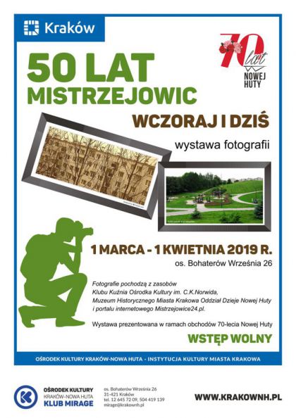 Prezentowane fotografie pochodzą z zasobów Klubu Kuźnia Ośrodka Kultury im. Norwida, Muzeum Historycznego Miasta Krakowa Oddział Dzieje Nowej Huty i portalu internetowego Mistrzejowice24.pl. Wystawę, zorganizowaną w Klubie Mirage Ośrodka Kultury Kraków-Nowa Huta (os. Bohaterów Września 26) z okazji obchodów 70-lecia powstania Nowej Huty, zwiedzać można przez cały marzec w godzinach otwarcia klubu.