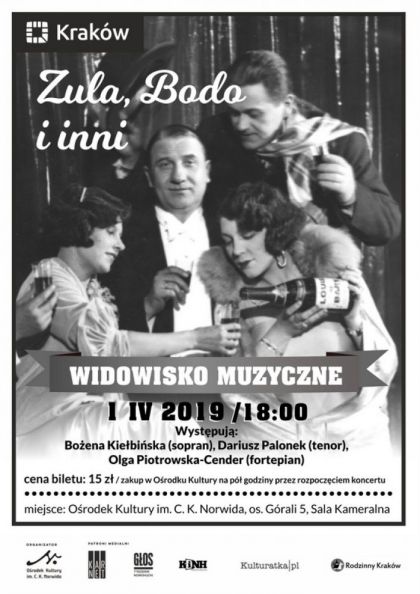 Ośrodek Kultury im. C. K. Norwida zaprasza na wieczór pełen humoru i dowcipu, który zawarty jest w piosenkach międzywojennych. Przypomnimy przeboje Zuli Pogorzelskiej, Eugeniusza Bodo oraz innych gwiazd filmu i kabaretu tamtych lat.