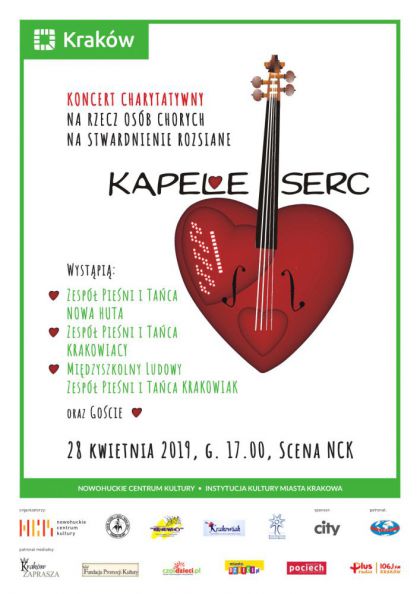 W tym roku mija 11 lat od momentu, kiedy po raz pierwszy w naszym kraju zagrały Kapele Serc. Pomysłodawcą tej ogólnopolskiej akcji charytatywnej jest Polska Sekcję CIOFF, która skutecznie promuje wydarzenie i z roku na rok zyskuje sobie coraz większe grono odbiorców. W 2010 roku akcja, dzięki staraniom Międzyszkolnego Ludowego Zespołu Pieśni i Tańca „Krakowiak”, pojawiła się w Krakowie. Do grona organizatorów krakowskich Kapeli Serc dołączył Zespół Pieśni i Tańca „Nowa Huta”, a także Zespół Pieśni i Tańca „Krakowiacy”. Tegoroczny koncert odbędzie się 28.04.2019 r. Na scenie zobaczymy całą paletę różnorakich formacji artystycznych. Publiczność będzie mogła podziwiać zarówno m.in. taniec towarzyski, angielskie i szkockie tańce balowe, taniec hollywoodzki, jak i współczesny. Nie zabraknie oczywiście folkloru, który pojawi się w wykonaniu MLZPiT „Krakowiak”, ZPiT „Nowa Huta”i ZPiT „Krakowiacy”. W trakcie trwania koncertu zorganizowana zostanie zbiórka pieniędzy do puszek, jak również loteria fantowa z atrakcyjnymi przedmiotami do wylosowania (m.in. książki, biżuteria, czy podarunek od Pana Prezydenta Jacka Majchrowskiego przekazany członkowi Powiatowej Społecznej Radzie ds. Osób Niepełnosprawnych, p. Małgorzacie Felger). Większość rzeczy, które znajdą się na loterii pochodzą od osób zaprzyjaźnionych z ww. Towarzystwem i z organizatorami. Tradycją jest to, iż krakowskie Kapele Serc dochód z loterii fantowej i zbiórki pieniędzy do puszek przekazują Polskiemu Towarzystwu Stwardnienia Rozsianego (Oddział w Krakowie).