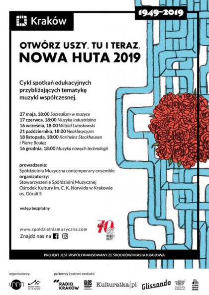 Otwórz Uszy. Tu i Teraz. Nowa Huta 2019 to comiesięczne spotkania, organizowane przez Spółdzielnię Muzyczną Contemporary Ensemble we współpracy z Ośrodkiem Kultury im. C. K. Norwida. Łączą w sobie profesjonalizm muzyków, którzy uczestniczyli w największych festiwalach muzyki nowej w Polsce i za granicą (Warszawska Jesień, Sacrum Profanum, Internationale Ferienkurse für Neue Musik w Darmstadt), z przystępną formą prezentacji, za której sprawą niezrozumiała pozornie muzyka zaczyna przemawiać „ludzkim głosem”. Od maja do grudnia 2019 r., w związku z obchodami 70 rocznicy powstania Nowej Huty organizatorzy podejmą tematy ważne dla rozwoju muzyki klasycznej w XX i XXI w, a przy tym powiązane z historią i rozwojem Nowej Huty, pod kątem przemian politycznych, społecznych, estetycznych, gospodarczych i technologicznych.