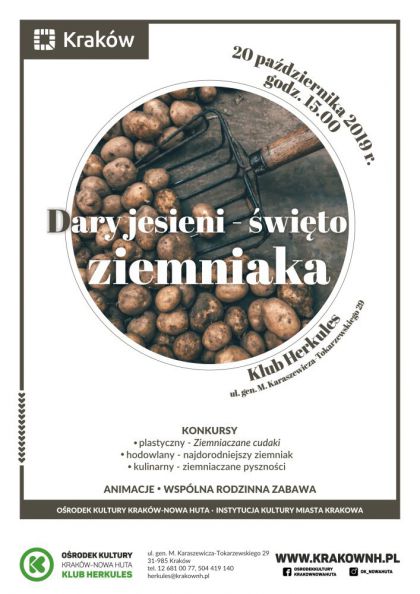 Klub Herkules Ośrodka Kultury Kraków-Nowa Huta (ul. gen. M. Karaszewicza-Tokarzewskiego 29) zaprasza 20 października o godz. 15.00 na rodzinną imprezę, wywodzącą się z bogatej tradycji wspólnego zdobienia i przetwarzania darów ziemi – zwłaszcza chętnie uprawianych w Branicach ziemniaków i dyń. W ramach festynu odbędą się konkursy: hodowlany i kulinarny – pierwszy na największe warzywo z miejscowej uprawy, drugi na najciekawsze danie obiadowe (bez deseru).