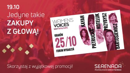 Już w najbliższą sobotę 19 października, klienci Serenady będą mieli okazję wziąć udział w wyjątkowej akcji promocyjnej. Po zakupach i okazaniu paragonów na minimum 400 zł będą mogli odebrać upominek – podwójny bilety na wyjątkowy koncert trasy Woman’s Voices w Krakowie. Bilety o wartości 170 zł (dla dwóch osób) to idealna okazja, aby przeżyć niecodzienne, muzyczne emocje w towarzystwie wybitnych, polskich artystek.