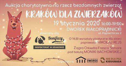 Koncert i aukcja „Kraków Dla Zwierzaków" odbędą się w niedzielę 19 stycznia 2020 r. o godzinie 16:00 w Dworku Białoprądnickim przy ul. Papierniczej 2 w Krakowie.