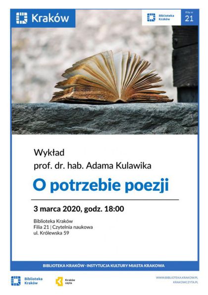 Spotkanie z prof. dr. hab. Adamem Kulawikiem, który podczas wykładów w czytelni naukowej podejmuje tematy z zakresu teorii i historii literatury. Tym razem pan profesor opowie o potrzebie poezji.