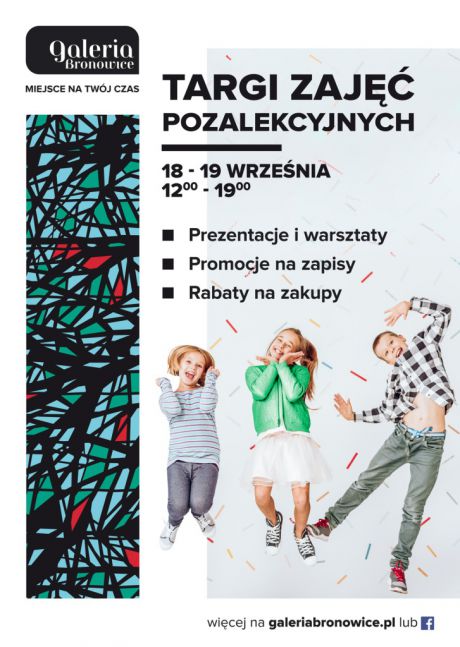Szkoła musicalowa, warsztaty chemiczne, badminton, judo, nauka rysunku, a może język norweski? Wszystkich rodziców, którzy szukają dla swoich pociech ciekawych kursów i zajęć dodatkowych, Galeria Bronowice zaprasza na Targi Zajęć Pozalekcyjnych. W dniach 18-19 września będzie można zapoznać się tu ze szczegółową ofertą ponad 40 wystawców, przekonać się jak wyglądają zajęcia w praktyce oraz otrzymać interesujące gadżety. Na wszystkich uczestników Targów czekać będzie również wiele innych atrakcji, m.in.: specjalne rabaty na zajęcia pozalekcyjne oraz warsztaty, podczas których będzie można zapoznać się z poszczególnymi aktywnościami.