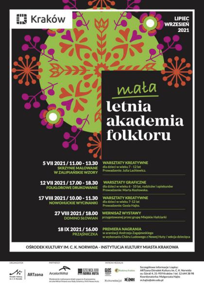 ARTzona Ośrodka Kultury im. C. K. Norwida zaprasza do udziału w Małej LETNIEJ AKADEMII FOLKLORU. W tym roku program Akademii adresowany jest przede wszystkim do najmłodszych mieszkańców Krakowa. W trakcie wydarzenia, typowo miejska dzielnica – Nowa Huta – stanie się przestrzenią folkloru, muzyki, tradycji i rękodzieła ludowego. Uczestnicy poznają charakterystyczne dla kultury ludowej znaczenia, elementy i zastosowania kultywowane dawniej i obecnie w regionie. Finałem Małej LETNIEJ AKADEMII FOLKLORU będzie premiera nagrania utworu „Prząśniczka” w aranżacji Andrzeja Zagajewskiego, w wykonaniu sekcji dziecięcej Chóru Ludowego z Nowej Huty.