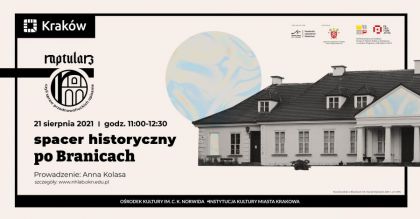 Pierwsza wzmianka źródłowa na temat Branic pojawia się około 1250 roku. Teren ten przez wieki należał do rodu Gryfitów. Podczas spaceru uczestnicy zwiedzą wybudowany przez nich późnorenesansowy dwór, łączony z warsztatem Santiego Gucciego. Poznają także ekspozycję archeologiczną oraz dowiedzą się o historii rodziny Badenich, którzy na terenie Branic wznieśli na początku XIX wieku klasyczny dworek polski.