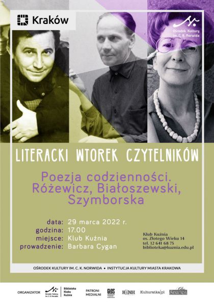 Urodzeni na początku lat 20. ubiegłego wieku, rocznikowo należeli do pokolenia Kolumbów. Jednak ich powojenna twórczość jest odrębna, "inaczej przeżyta". Przy całej odmienności stylistycznej, łączy ich zainteresowanie zwyczajnością, która potrafi rozsadzić "szczeliny istnienia". Zapraszamy na Literacki Wtorek Czytelników poświęcony poezji Tadeusza Różewicza, Mirona Białoszewskiego i Wisławy Szymborskiej.