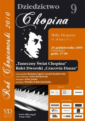 W ramach kolejnego spotkania z cyklu „Dziedzictwo Chopina” w Willi Decjusza zaprezentowany zostanie najnowszy projekt Baletu Dworskiego Cracovia Danza, zatytułowany „Taneczny Świat Chopina”. Premierowy spektakl, wpisujący się w program przygotowań do obchodów Roku Chopinowskiego 2010, oparty został na muzyce tanecznej kompozytora. Jego kompozycje stały się kanwą taneczno - pantomimicznego widowiska w wykonaniu tancerzy Baletu Dworskiego, w inscenizacji Romany Agnel i Artura Borkowskiego.