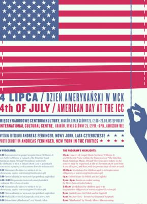 4 lipca − wyjątkowa data dla wszystkich Amerykanów będzie też w tym roku świętowana w Międzynarodowym Centrum Kultury, a to za sprawą nowej wystawy „Andreas Feninger. Nowy Jork, lata czterdzieste”, przygotowanej wspólnie z Konsulatem Generalnym Stanów Zjednoczonych w Krakowie. Zaplanowanych jest wiele atrakcji dla całej rodziny, zwiedzanie wystawy z kuratorem (13.00 i 15.00), koncert muzyki gospel Oscar Williams Jr. and Perfected Praise (12.00), warsztaty dla dzieci pt „Koszulka w wielkim mieście” (12.45 i 14.45), Wykład Krzysztofa Kasprzyka, który przez ostatnie 5 lat pełnił funkcję Konsula Generalnego RP w Nowym Jorku, zatytułowany "Mój Nowy Jork" (16.00), a na zakończenie, o godz. 18.00, projekcja filmu „Manhattan", reż. Woody Allen.