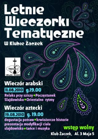 Serdecznie zapraszamy na niezapomniane chwile podczas wieczorku azteckiego! To prawdziwa podróż do minionych czasów kultur prekolumbijskiej Ameryki! Będziecie mogli zasmakować potraw z tego wspaniałego kontynentu, popijając kakao z dodatkiem chilli, wsłuchując się w rytmy indiańskiej muzyki! Zapraszamy także do zaznajomienia się z podstawowymi krokami tanecznymi, oraz wysłuchania ciekawych prelekcji na tematy tego krwiożerczego, ale jakże intrygującego ludu!