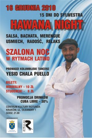 Gwiazdą wieczoru będzie Yesid Samir Chala Puello. Urodził się 28 lat temu w Cartagena de Indias w Kolumbii. Przygodę z tańcem rozpoczął jako mały chłopiec. Po 5 latach nauki rytmów afro karaibskich w szkole podstawowej wstąpił do Akademia National de Artes de Cartagena , gdzie szkolił swój warsztat taneczny przez kolejnych lat 6. W czasie studiów występował najpierw w zespole EKOBIS przy Universidad Technologica de Bolivar w Cartagenie, gdzie tańczy się kolumbijski folklor i contemporary latin dance czyli salsa, merengue, guaguanco, son etc. Prowadzi zajęcia, pokazy i warsztaty w Polsce i za granicą. W 2007 roku otrzymał na Primavera Salsa Open 2 miejsce z formacją BARRIO LATINO , a następnie sukces ten powtórzył w IDO Salsa Masters. Obecnie specjalizuje się w nauczaniu tańców latynoskich: salsa, bachata, cha cha cha , rumba, samba , merengue , reggaeto i nadal prowadzi salsową formację BARRIO LATINO.
