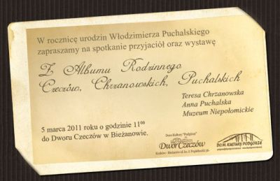 W 102.rocznicę urodzin Włodzimierza Puchalskiego Dwór Czeczów w Krakowie oraz Muzeum Niepołomickie "Zamek Królewski w Niepołomicach" zapraszają na wernisaż wystawy "Z albumu rodzinnego Czeczów, Chrzanowskiech, Puchalskich"