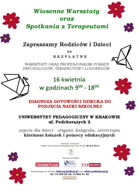 Zapraszamy serdecznie wszystkie dzieci, ich rodziców oraz opiekunów na bezpłatne warsztaty - z kaligrafii, arteterapii i origami - a także na spotkania i konsultacje z psychologami, pedagogami, terapeutami oraz logopedami. To świetna okazja by zdiagnozować gotowość pociech do podjęcia nauki szkolnej, sprawdzić ich możliwości a także spędzić wspólnie czas w kreatywny sposób! Warsztaty odbędą się w dniu 16 kwietnia 2011 r. na Uniwersytecie Pedagogicznym w Krakowie, ul. Podchorążych 2, w godz. 9.00-18.00.