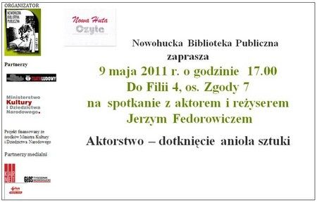 W Tygodniu Bibliotek (8-15 maja 2011), którego tegoroczne hasło brzmi „Biblioteka zawsze po drodze, nie mijam wchodzę” odbędzie się spotkanie z Jerzym Fedorowiczem – aktorem, reżyserem, wieloletnim dyrektorem naczelnym i artystycznym Teatru Ludowego. Jerzy Fedorowicz będzie czytał fragmenty książki Mariusza Wollnego pt. "Kacper Ryx", która w najbliższym czasie zostanie zakupiona do Oddziału Książki Mówionej Nowohuckiej Biblioteki Publicznej.