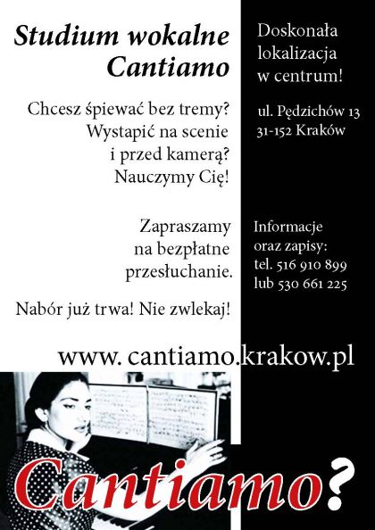“Cantiamo” to nowa , muzyczna inicjatywa w magicznym, starym Krakowie. Każdy, dla kogo śpiew jest pasją lub spełnieniem marzeń zawodowych otrzyma w naszym studium możliwość rozwoju umiejętności wokalno - aktorskich w zakresie muzyki operowej, oratoryjnej i estradowej oraz pracy przed kamerą.