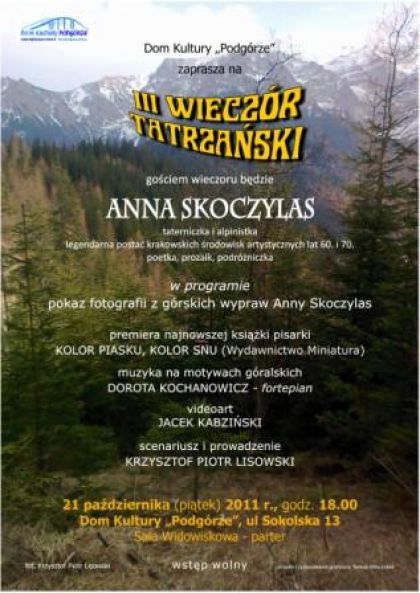 W październiku III Wieczór Tatrzański będzie podwójnie premierowy: gościem programu będzie Anna Skoczylas – taterniczka i alpinistka, legendarna postać krakowskich środowisk artystycznych, pisarka i podróżniczka, która po raz pierwszy pokaże niezwykłe fotografie ze swych wypraw górskich. W młodości wraz z mężem Adamem Skoczylasem (zm. 1966 r. taternikiem, alpinistą, himalaistą, autorem książek: 4 dni słońca, Biała Góra, Tam, gdzie góry sięgają nieba) uprawiała czynnie taternictwo i alpinizm, turystykę wysokogórską i narciarstwo oraz trekking w Himalajach. Brała udział w wielu wyprawach do krajów Azji, Afryki, Ameryki Południowej. Plonem tych podróży są zdjęcia i wiersze.