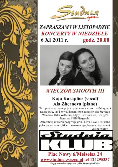 W repertuarze duetu pojawią się tego wieczoru refleksyjne i nastrojowe, jak i żywe, dynamiczne kompozycje: Steviego Wondera, Billa Withersa, Edyty Bartosiewicz, George'a Bensona i Elli Fitzgerald.