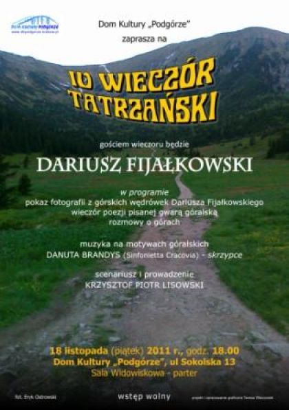 Gościem wieczoru będzie DARIUSZ FIJAŁKOWSKI w programie pokaz fotografii z górskich wędrówek Dariusza Fijałkowskiego, wieczór poezji pisanej gwarą góralską, rozmowy o górach.