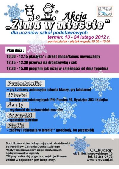 Zapisy w biurze CK "Ruczaj", ul. Rostworowskiego 13, od pn-pt w godz. 13:00-21:00, tel. 12 266 09 73 lub mailowo: biuro@ckruczaj.pl.