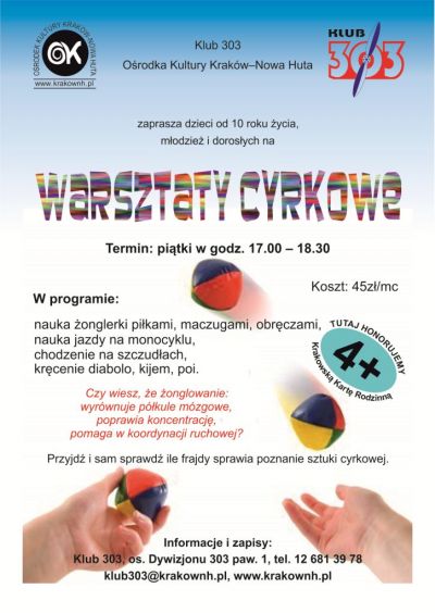 Czy wiesz, że żonglowanie: wyrównuje półkule mózgowe, poprawia koncentrację, pomaga w koordynacji ruchowej? Przyjdź do Klubu 303 Ośrodka Kultury Kraków-Nowa Huta i sam sprawdź ile frajdy sprawia poznanie sztuki cyrkowej. Zapraszamy zarówno dzieci od 10 roku życia jak i mł...odzież oraz dorosłych.