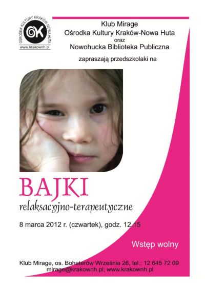 Zapraszamy przedszkolaki do Klubu Mirage Ośrodka Kultury Kraków-Nowa Huta na cykliczną imprezę prowadzoną przez Nowohucką Bibliotekę Publiczną. Są to zajęcia edukacyjno – relaksacyjne z elementami dramy i ćwiczeń oddechowych oraz polegające na czytaniu i analizie bajek.