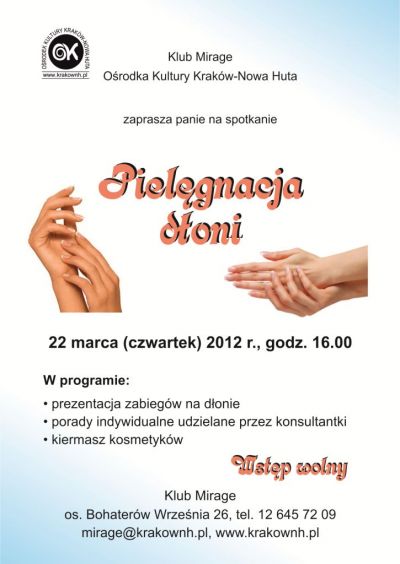 Spotkanie w Klubie Mirage Ośrodka Kultury Kraków-Nowa Huta dla osób chcących zadbać o piękne dłonie na wiosnę. W programie: indywidualne porady kosmetyczne prezentacja zabiegów na dłonie oraz kiermasz kosmetyków.