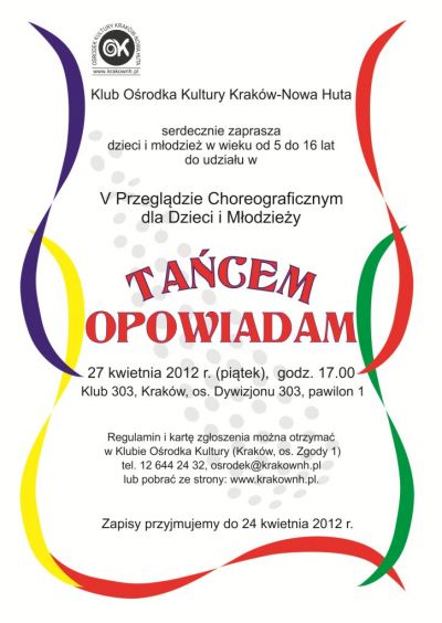 Klub Ośrodka Kultury zaprasza do udziału w V Przeglądzie Choreograficznym dla Dzieci i Młodzieży. Zgłoszenia przyjmowane będą do 24 kwietnia 2012 r.