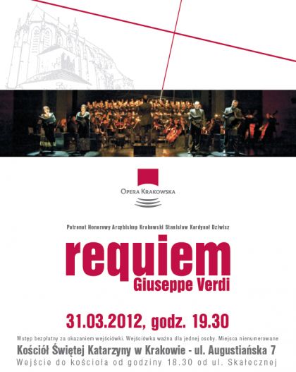 Instytut Dialogu Międzykulturowego imienia Jana Pawła II i Opera Krakowska zapraszają 31 marca, w wigilię Niedzieli Palmowej, w kościele św. Katarzyny Aleksandryjskiej w Krakowie – ul. Augustiańska 7, zaprezentowane zostanie „Requiem” Giuseppe Verdiego. Wydarzenie odbędzie się pod patronatem Jego Eminencji Księdza Kardynała Stanisława Dziwisza.
