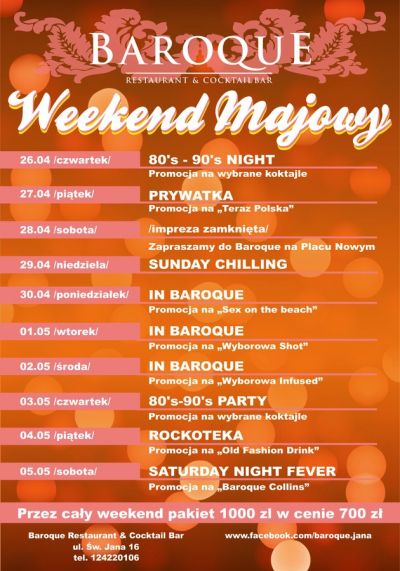 W dniach 26 kwiecień – 5 maj krakowski Baroque Restaurant & Cocktail Bar zaprasza na niepowtarzalny i najdłuższy weekend w roku – Weekend Majowy! W tych dniach przy ulicy Świętego Jana każdy znajdzie dla siebie coś ciekawego, a oprócz imprez przewidziano wiele promocji!