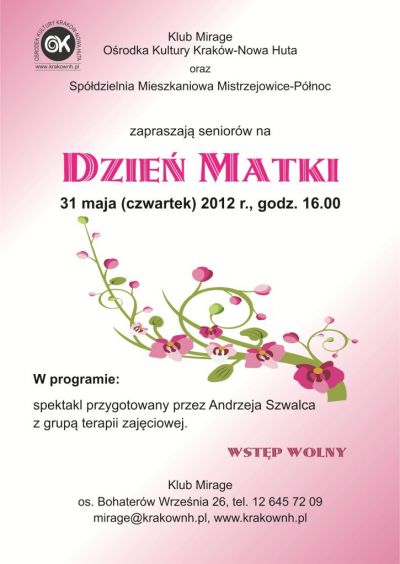 Tradycyjna impreza w Klubie Mirage Ośrodka Kultury Kraków-Nowa Huta z okazji Dnia Matki dla seniorów, którą uświetni spektakl przygotowany przez Andrzeja Szwalca z grupą terapii zajęciowej. Współorganizatorem imprezy jest Spółdzielnia Mieszkaniowa Mistrzejowice-Północ.