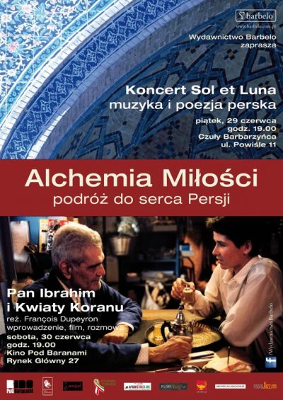 Wydawnictwo Barbelo we współpracy z krakowskim Kinem Pod Baranami i otwartą niedawno krakowską księgarnio-kawiarnią „Czuły Barbarzyńca” zaprasza na dwa spotkania „Alchemia Miłości – Podróż do serca Persji”. Spotkania, inspirowane wydaną niedawno książką „Alchemia Miłości – wybór myśli sufickich” (Wydawnictwo Barbelo 2012), mają przybliżyć czytelnikom filozofię oraz symbolikę sufizmu – mistycznego nurtu islamu.