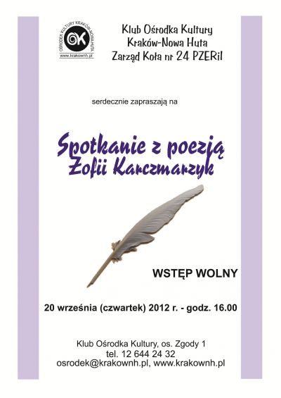 Klub Ośrodka Kultury Kraków-Nowa Huta (os. Zgody 1) zaprasza 20 września 2012 r. (czwartek) o godz. 16.00 na popołudnie z poezją.