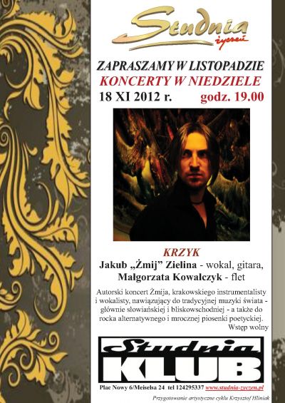 Autorski koncert Żmija, krakowskiego instrumentalisty i wokalisty, nawiązujący do tradycyjnej muzyki świata - głównie słowiańskiej i bliskowschodniej - a także do rocka alternatywnego i mrocznej piosenki poetyckiej.