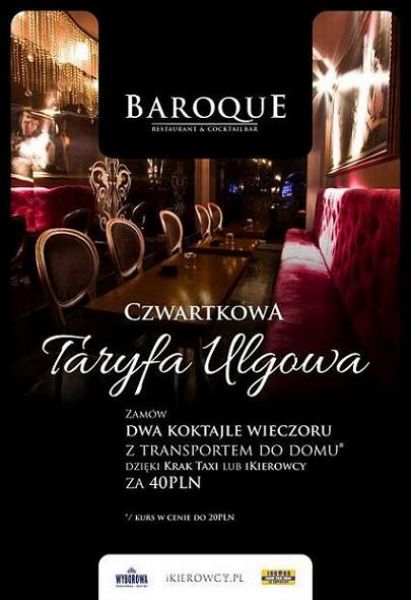 Masz ochotę na dobrego drinka po pracy lub spędzenie miłego wieczoru ze znajomymi i nie martwić się o powrót do domu? Jeżeli nasuwa Ci się odpowiedź "TAK!" to Baroque Club przygotował idealne rozwiązanie! W każdy czwartek, za 40 PLN otrzymasz 2 wyśmienite koktajle oraz transport do domu!