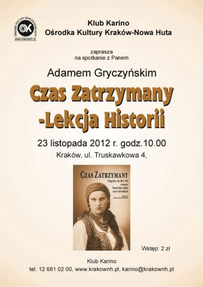 Zapraszamy dzieci i młodzież do Klubu Karino Ośrodka Kultury Kraków-Nowa Huta na spotkanie z Adamem Gryczyńskim autorem książki Czas zatrzymany. Fotografie z lat 1883-1963 z terenów Nowej Huty i okolic oraz wybór tekstów, za którą otrzymał Nagrodę Krakowska Książka Miesiąca. Wykład połączony będzie z prezentacją zdjęć.