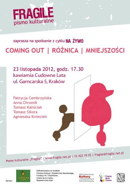 Pismo kulturalne „Fragile” serdecznie zaprasza na spotkanie poświęcone tematowi przewodniemu aktualnego numeru. W spotkaniu wezmą udział: Anna Chromik, Patrycja Cembrzyńska, Tomasz Kaliściak, prowadzenie: Tomasz Sikora i Agnieszka Kwiecień.