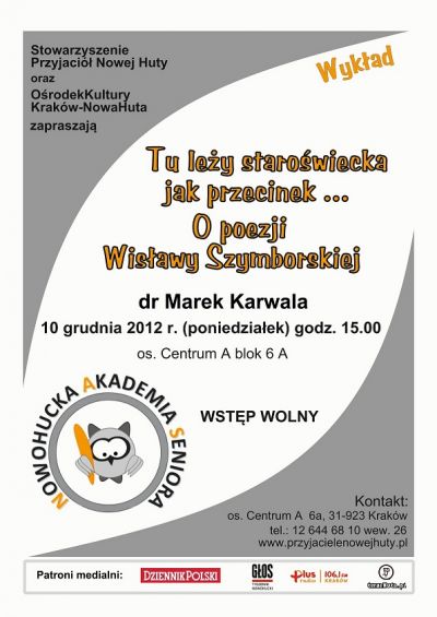 Podczas kolejnego swojego wykładu w Nowohuckiej Akademii Seniora dr Marek Karwala przybliży zebranym osobę krakowskiej noblistki - Wisławy Szymborskiej. W prelekcji nie zabraknie informacji o życiu poetki, fenomenie jej twórczości, postawie wobec świata, życia i ludzi, a także o jej literackim Noblu. Zapraszają: Stowarzyszenie Przyjaciół Nowej Huty oraz Ośrodek Kultury Kraków-Nowa Huta.
