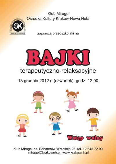 Klub Mirage Ośrodka Kultury Kraków-Nowa Huta (os. Bohaterów Września 26) zaprasza 13 grudnia 2012 r. o godz. 12.00 na kolejne bajki terapeutyczno-relaksacyjne.