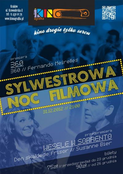 Tradycyjnie 31 grudnia zapraszamy na Sylwestrową Noc Filmową do Agrafki. W programie filmowym najnowsza produkcja Fernando Meirellesa 360, oraz przedpremierowo WESELE W SORRENTO Susanne Bier. Ponadto coś do przegryzienia, napoje bezalkoholowe i lampka wina musującego o północy.