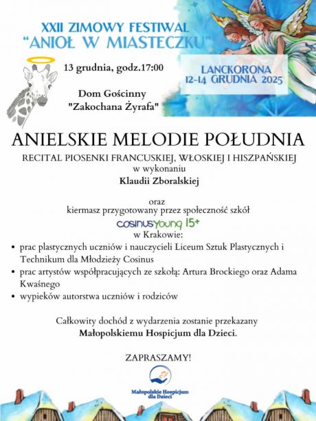 13 grudnia o godzinie 17.00 w nietuzinkowych wnętrzach Domu Gościnnego Zakochana Żyrafa w Lanckoronie odbędzie się niezwykłe wydarzenie przygotowane przez społeczność szkół CosinusYoung 15+ w Krakowie. W ramach XXII Zimowego Festiwalu „Anioł w Miasteczku”, jednego z najbardziej rozpoznawalnych grudniowych wydarzeń artystycznych w regionie, publiczność będzie miała okazję uczestniczyć w recitalu „Anielskie Melodie Południ (...)