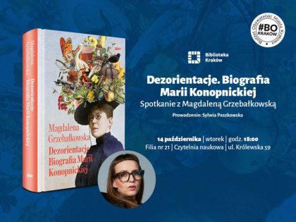 Spotkanie z Magdaleną Grzebałkowską, pisarką, reporterką, autorką bestsellerowych biografii Beksińskich, Komedy, ks. Twardowskiego i reportaży historycznych, dwukrotnie nominowaną do Nagrody Literackiej „Nike”. Przedmiotem spotkania będzie najnowsza książka pisarki Dezorientacje. Biografia Marii Konopnickiej. Spotkanie poprowadzi Sylwia Paszkowska.